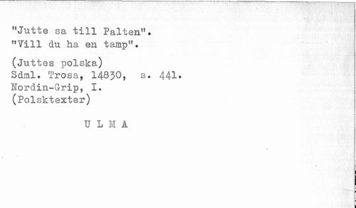 //// "Jutte sa till Palten". //// "Vill du ha en tamp". //// (juttes polska) //// Sdml. Trosa, 14830, s. 441. //// Nordin-Grip, 1. //// (Polsktexter) //// U L M A //// t ////