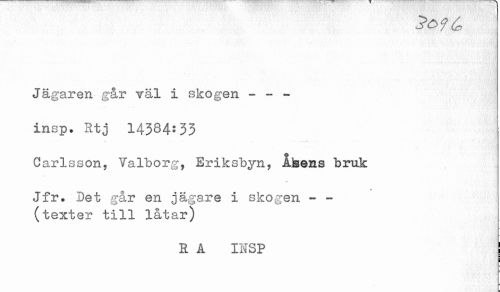 //// Jägaren gar väl i skogen - - - //// insp. Rtj 14334:33 //// Carlsson, Valborg, Eriksbyn, Åsens bruk //// * //// Jfr. Det gar en jägare i skogen - - //// (texter till låtar) //// R Å INSP ////