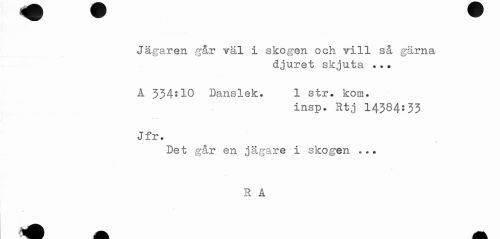 //// Jägaren gar väl i skogen och vill sa gärna //// djuret skjuta ... //// A 334:10 Danslek. 1 str. kom. //// insp. Rtj 14384:33 //// Jfr. //// Det gar en jägare i skogen ... //// R A ////