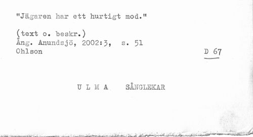 //// "Jägaren har ett hurtigt mod." //// (text o. beskr.) //// Ang. AnundsjSy 2002:3, s. $1 //// Ohlson D 67 //// U L H A SÅNGLEKAR ////