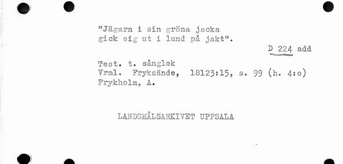 //// "Jägarn i sin gröna jacka //// gick sig ut i lund på jakt". //// D 224 a<id //// Test. t. sånglek //// Vrml. Fryksände, 18123:15? s. 99 (h. 4:o) //// Frykholm, A. //// LANDSLdLSAin:iVET UPPSALA //// - ** ^^ ////