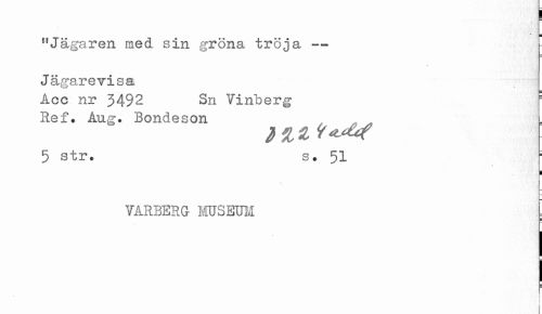 //// "JS,garen med sin gröna, tröja — //// Jägarevisa //// Acc nr 3492 Sn Vinberg ' //// Ref. Ang. Bondeson . „ //// 5 str. s. 51 //// i //// VARBERG MUSEUM ////
