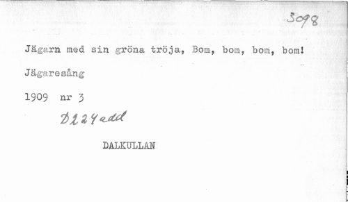 //// Jägarn med sin gröna tröja, Bom, bom, bom, bom! //// + - * //// Jägaresång //// 1909 nr 3 //// DALKULLA ////