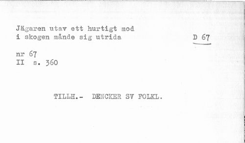 //// Jägaren utav ett hurtigt mod //// i skogen månde sig utrida D 67 //// nr 67 //// II s. 36O //// TILLH.- DENCKER S? FOLKL. ////