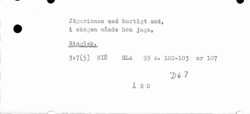 //// Jägarinnan med hurtigt mod, //// ^^ i skogen månde hon jaga, //// Ringlek. //// 3:7(5) NIO SLA 99 s. 102-103 nr 107 //// ÅBO //// it j ^ — ////