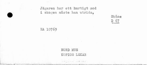 //// Jägaren har ett hurtigt mod //// ^^ i skogen måste han utrida, //// ^^ Skåne //// D 67 //// HA IO769 //// NORD MUS //// KOPIOR LEKAR //// ' ! ** ' , ^ //// A -- //// ' 1 - . ////