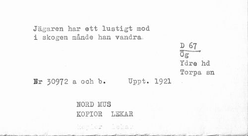 //// Jägaren har ett lustigt mod //// i skogen månde han vandra //// D 67 //// Og //// Ydre hd //// Torpa sn //// Er 30972 a och b. Uppt. l$21 //// - //// NORD MUS //// KOPIOR LEKAR ////