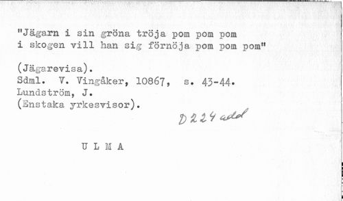 //// "Jägarn i sin gröna tröja pom pom pom //// i skogen vill han sig förnöja pom pom pom" //// (Jägarevisa). //// Sdml. V. Vingåker, IO867, s. 43-44. //// Lundström, J. //// (Enstaka yrkesvisor). //// U L H A //// ! ////