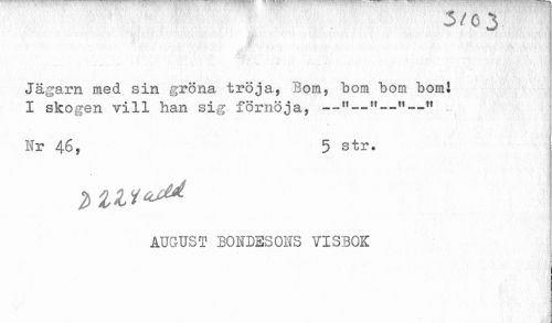 //// J //// Jägarn med sin gröna tröja. Bom, bom bom bomi //// I skogen vill han sig förnöja, —"—"--"—" //// % ' //// Nr 46, 5 str. //// AUGUST BONDESONS VISBOK ////