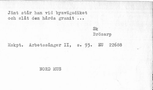 //// Jämt står han vid byavägsdiket //// och slåt den hårda granit ... //// Sk //// Brösarp //// Mskpt. Arbetssanger II, s. 93. EU 22688 //// NORD MUS ////