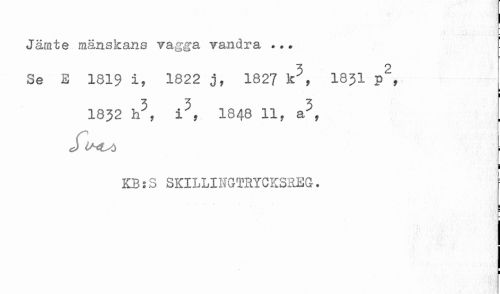 //// Jämte mänskans vagga vandra ... //// Se E 1819 i, 1822 j, 182? k^, I83I //// ' . . . . ' - - ' ' //// 1832 h^y 1848 lly a^, //// i //// KB:S SKILLINGTRYCKSREG. ////