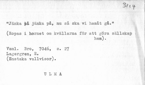 //// ...-..-. ' -- * - ' ' ^ ' //// "Jänka ^å jänka på, nu så ska vi hemåt gå." //// (Ropas i hornet om kvällarna för att gora sällskap //// hem). //// Vsml. Bro, 7046, s. 27 //// Lagergren, E. I //// (Enstaka vallvisor). //// U L M A ////