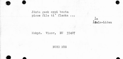 //// Jänta geck oppi bosta //// pisse file ti^ flaska . . //// An //// ABals-Liden //// * ' * ' * * ? f * ^ i ^ . ^ //// Ci ^ ^-*! *'. - t ^ //// j ' //// Mskpt. Visor, EU 39407 //// NORD MUS //// ^ ' . ' \ ' .t ////