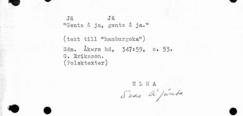 //// Jä Jä //// "Genta å ja, genta a ja." //// (text till "hamburgska") //// Sdm. Åkers hd, 347^59? s. 53. //// G. Eriksson. //// (Polsktexter) //// U L M A , //// Jl^ ^^^^ ////