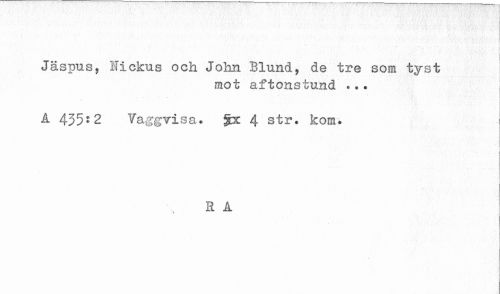 //// Jäspus, Nickus och John Blund, de tre som tyst //// mot aftonstund ... //// A 435:2 Vaggvisa, ^x 4 str. kom. //// RA ////
