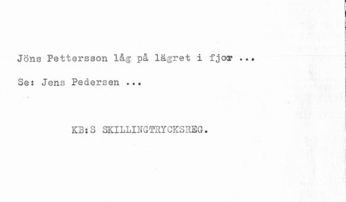 //// Jöns Pettersson låg på lägret i fjoar ... //// Se: Jens Pedersen ... //// KB:S SKILLINGTRYCKSREG. //// i //// < ////