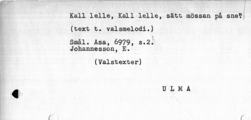 //// * . ' - . .. .. - - . i //// Kall lelle, Kall lelle, sätt mössan på sne? //// (text t. valsmelodi.) //// Smål. Asa, 6979, s.2. //// Johannesson, E. //// .. — ^ //// (Valstexter) //// ^ U L M A //// g # ^ //// s r r ////