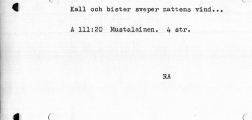 //// ^ Kall och bister sveper nattens vind... //// # //// A 111:20 Mustalainen. 4 str. //// ' *. //// . //// RA //// f r ////