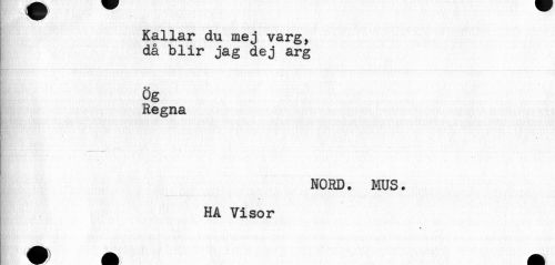 //// Kallar du mej varg, //// då blir jag dej arg //// - //// ög //// Regna //// NORD. MUS. //// HA Visor ////