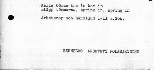 //// Kalle Göran kom in kom in //// släpp tömmarna, spring in, spring in //// ^ Arbetsrop och härmljud 1-11 s.264. //// t*' //// i ' //// ! REHNBERG ARBETETS FOLKDIKTNING ////