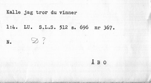 //// Kalle jag tror du vinner //// 1:4. LU. S.L.S. 512 s. 696 nr 367. //// N. ^ ? //// ** //// ÅBO //// _- . . - _ _ ______________/ ////