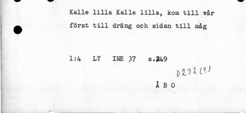 //// Kalle lilla Kalle lilla, kom till vår //// I ^ först till dräng och sidan till måg //// 1:4 LT INE 37 s.349 //// ÅBO ////