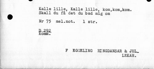 //// Kalle lille, Kalle lille, kom,kom,kom. //// ^ Skall du få det du bad mig om //// Nr 75 mel.not. 1 str. //// P 2% //// komm. //// F EGGELING RINGDANSAR & JUL- //// LEKAR . ////