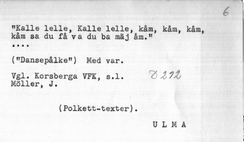 //// "Kalle lelle, Kalle lelle, kåm, kåm, kåm, //// kåm sa du få va du ba mäj åm." //// 1* + * * //// ("Dansepålke") Med var. //// Vgl. Korsberga VFK, s.l. //// Möller, J. //// (Polkett-texter). //// i ////