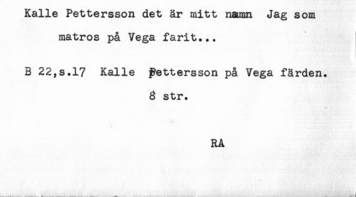 //// nalle Pettersson det ar mitt namn Jag som //// matros på Vega farit... //// B 22,s.l7 Kalle Pettersson på Vega färden. //// 3 str. //// RA ////