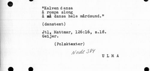 //// "Kalven d ansa //// å rompa slong //// å må dansa hele mårdsund." //// (danstext) //// Jtl, Mattmar, 126:16, s.l3. //// Geijer. //// (Polsktexter) ////