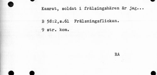 //// Kamrat, soldat i frälsingshären är jag... //// B 53:2,s.61 Frälsningsflickan. //// 9 str. kom. //// '' * //// RA ////