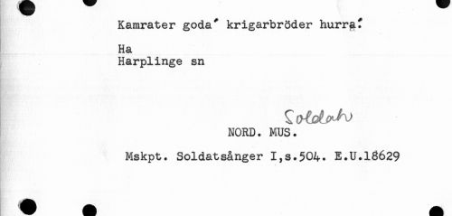 //// Kamrater goda^ krigarbröder hurr§? //// Ha //// Harplinge sn //// NORD. MUS. //// Mskpt. Soldatsånger I,s.$04. E.U.13629 ////