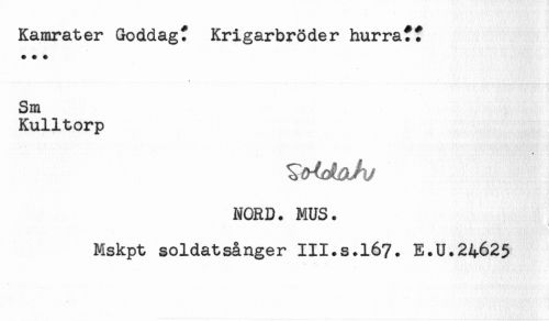 //// Kamrater Goddagf Krigarbröder hurra?? //// * + + //// Sm //// Kulltorp //// * //// NORD. MUS. //// Mskpt soldatsånger III.s.167. E.U.24625 ////