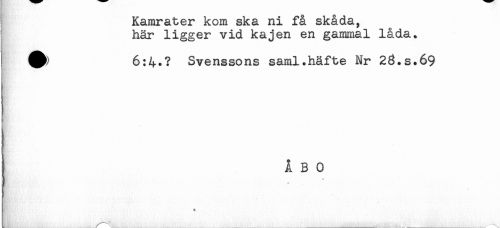 //// Kamrater kom ska ni få skåda, //// här ligger vid kajen en gammal låda. //// 6:4.? Svenssons saml.häfte Nr 23.S.69 //// i ÅBO //// y //// + ////