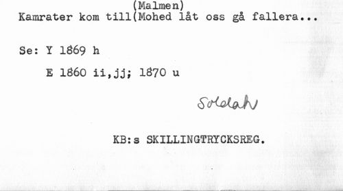 //// Kamrater kom till(Mohed låt oss gå fallera... //// Se: Y 1369 h //// E 1360 ii,jj; 1370 u //// KB:s SKILLINGTRYCKSREG. ////