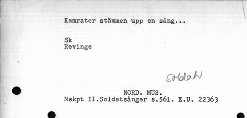 //// Kamrater stämmen upp en sång... //// Sk //// * //// Revinge //// & //// t //// # NORD. MUS. //// Mskpt II.Soldatsånger s.56l. E.U. 22363 ////