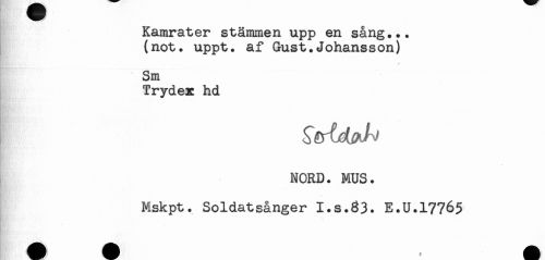 //// Kamrater stämmen upp en sång... //// (not. uppt. af Gust.Johansson) //// Sm //// Trydex hd //// NORD. MUS. //// Mskpt. Soldatsånger I.s.83. E.U.17765 ////