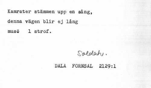 //// Kamrater stämmen upp en sång, //// denna vägen blir ej lång //// mus§ 1 strof. //// DALA FORNSAL 2129:1 ////