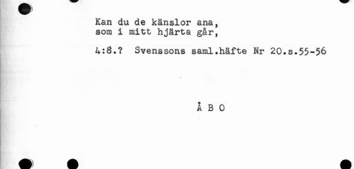 //// Kan du de känslor ana, //// som i mitt hjärta går, //// * - //// 4:8.? Svenssons saml.häfte Nr 20.s.55-56 //// * //// ÅBO //// ** ////