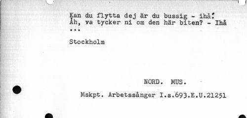 //// Kan du flytta dej är du bussig - ihåf //// Ah, va tycker ni om den här biten? - Ihå //// + * * //// Stockholm //// < //// NORD. MUS. //// ^ Mskpt. Arbetssånger 1.s.693.E.U.21251 ////