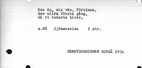 //// Kan du, min vän, förnimma, //// den allrq första gång, //// då vi bekanta blevo, //// s.33 Sjömansvisa 5 str. //// ^ HEMBYGDSMINNEN BORGÅ 1934 ////