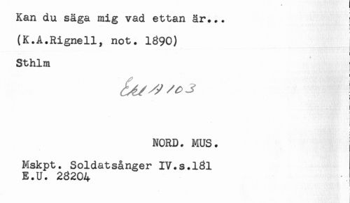 //// Kan du säga mig vad ettan är*.. //// (K.A.Rignell, not. 1890) //// Sthlm //// i //// i //// i //// ) //// NORD. MUS. //// Mskpt. Soldatsånger IV.s.lSl //// E.U. 28204 //// < ////