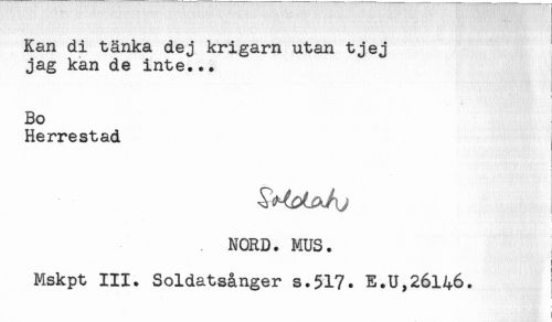 //// Kan di tänka dej krigarn utan tjej //// jag kan de inte... //// Bo //// Herrestad //// NORD. MUS. //// Mskpt III. Soldatsånger s.517. E.U,26l46. //// ) //// < ////