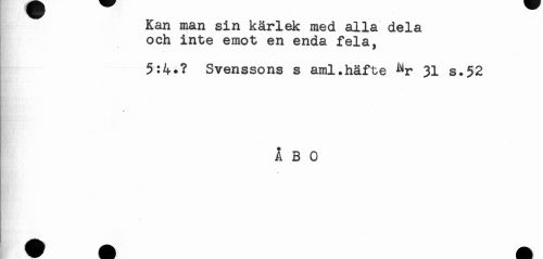 //// Kan man sin kärlek med alla dela //// och inte emot en enda fela, //// * //// 5:4.? Svenssons s aml.häfte ^r 31 s.52 //// ÅBO //// . * //// A- ^ ^^ ^ ////