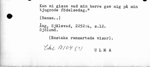 //// Kan ni gissa vad min herre gav mig på min //// tjugonde födelsedag." //// * (Ramsa..) //// Ang, Sjålevad, 2252:4, s.12. //// Sjölund. //// (Enstaka ramsartade visor). ////