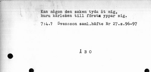 //// - '*' '-" ** ** * - - ' ---' * * ...... //// Kan någon den saken tyda åt mig, //// huru kärleken till förstx yppar sig. //// * . ^ . . ...... . * //// 7:4.? Svensson saml.häfte Nr 27.s.96-97 //// ÅBO ////