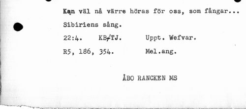 //// Kqn väl nå värre höras för oss, som fångar... //// ^ Sibiriens sång. //// ; 22:4. KB/T J. Uppt. Wefvar. //// R5, 186, 354. Mel.ang. //// ÅBO RANCKEN MS ////