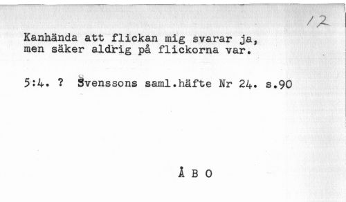 //// Kanhända att flickan mig svarar ja, //// men säker aldrig på flickorna var. //// 5:4* ? Svenssons saml.häfte Nr 24. s.90 //// t ////