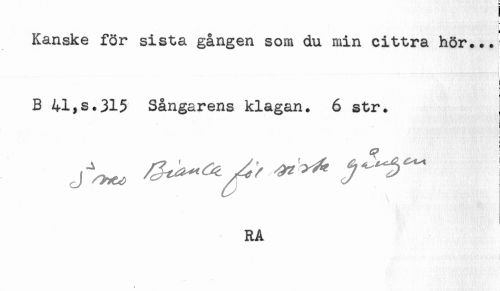 //// Kanske för sista gången som du min cittra hör...! //// ! //// B 41,s.315 Sångarens klagan. 6 str. //// i //// c //// RA //// t t ////