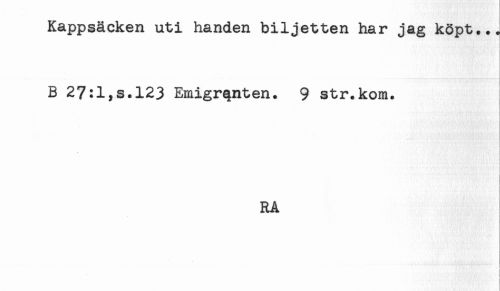 //// Kappsäcken uti handen biljetten har jag köpt... //// B 27:1,s.123 Emigranten. 9 str.kom. //// RA ////